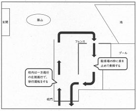 生徒送迎時の進入経路並びに駐車場利用についてのお願い 2025年1月7日 に koncyuhp が投稿 生徒の安全確保のため、来校の際は下図のように一方通行で進入していただき、徐行運転と駐車場枠内で停車・乗降をお願いいたします。