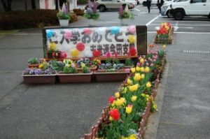 4月10日(金)今田中学校第80回入学式を行いました。21名の1年生が今田中学生への仲間入りです。中学校生活の中で、自分の可能性をどんどん伸ばしてほしいと思います。保護者の皆様、ご来賓の皆様、本日はご多用の中、入学式にご出席いただきありがとうございました。また市老人クラブ連合会今田支部様より、さぎそうホール玄関前に春らしいお花を植えていただき、心温まるお心遣いに感謝しております。ありがとうございました。