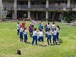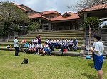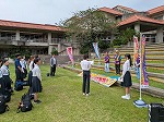 読谷村の入村式では、歌や踊りであたたかく迎えていただきました。各家庭での体験は、三線の演奏をしたり、琉球衣装を着たり、沖縄料理作りをさせていただきました。退村式では、三線の演奏にあわせてみんなで輪になって踊りました。3年生の生徒はみんな笑顔で元気です。これからトロピカルビーチでのマリン体験に向かいます。